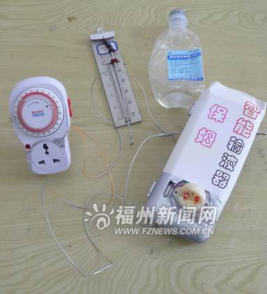 病人輸液難受,陪護(hù)的家人更辛苦,一連一兩個(gè)小時(shí)盯著吊瓶看,就怕發(fā)生血液倒流或其他意外。福州教育學(xué)院附中的黃荻同學(xué)發(fā)明了一種智能輸液器保姆,能在點(diǎn)滴快結(jié)束時(shí)及時(shí)發(fā)出警報(bào),還能監(jiān)控輸液的速度,減輕護(hù)理人員和病人家屬的負(fù)擔(dān)。
