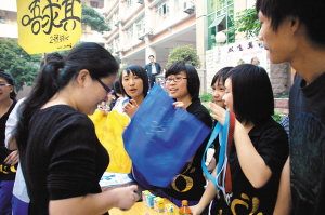 學校新開了射擊場?別誤會,這是高一一班男生盧布布開的檔口——“布布射擊場”。“以前感覺政治課的價值規(guī)律很抽象,現(xiàn)在終于能理解。”盧布布說,“如商品多競爭大,賣的商品怎樣才能吸引顧客?一要價格方面比學校和外面地攤都要低,又要賣別人不賣的東西!逼渲幸幻M員是學校公關部部長,由于有一定的和企業(yè)打交道的經驗,懂得怎樣別出心裁地“打響招牌”。最后他們借鑒了廣場的娛樂元素,讓射擊中獎者可獲得食模玩具獎勵,同時布布還戴上兔耳朵舉牌攬客,這樣招攬了不少顧客!艾F(xiàn)在終于體會到父母‘揾食’的艱辛了,”盧布布說,現(xiàn)時學業(yè)繁重,擠出時間進貨,晚上11、12點才回家,光挑貨也挑上一小時,而且內部在進貨種類上還存在分歧。后來,布布還是讓十余個組員每人負責不同的細項,他們的“企業(yè)”才順利建起,“要辦好一家企業(yè),團隊協(xié)作非常重要!”最后射擊場銷售額700元,盈利200多元,布布表示,更重要的是通過這次活動,體會到和社會接軌的感覺。