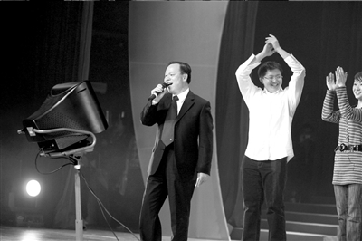略顯緊張的周校長“喝口水”的要求得到滿足后,便從衣袋里掏出一張寫有歌詞的白紙,正式開唱。他手握麥克風(fēng),緊盯臺(tái)上的卡拉OK屏幕,高潮處他還會(huì)踮起腳尖“飆高音”。此時(shí),上任校長許智宏微笑著坐在臺(tái)下,隨聲輕和。