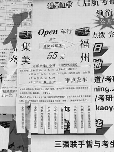 昨日(1月15日),記者走訪廈門幾所高校發(fā)現(xiàn),在學(xué)校餐廳、宿舍樓、廣告信息欄等多處地方都貼了很多包車業(yè)務(wù)的小廣告,大部分留下的都是校內(nèi)學(xué)生的聯(lián)系電話,目的地一般是福州、三明、南平等地。記者從包車廣告上看到,每天最少有兩個車次,最多高達4個。