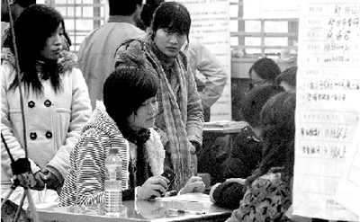 來(lái)自許昌學(xué)院的陳明軍告訴記者,經(jīng)過(guò)3個(gè)多月找工作的艱苦經(jīng)歷,他對(duì)未來(lái)工資的期望值已經(jīng)從原本的月薪2000元跌到了1000元!捌鋵(shí)我們應(yīng)該懂得變通,這樣才能應(yīng)對(duì)就業(yè)壓力!庇浾咴诂F(xiàn)場(chǎng)了解到,大多數(shù)畢業(yè)生對(duì)薪酬的期望值在1000元左右,800元也可以接受,試用期工資600元一個(gè)月就行。