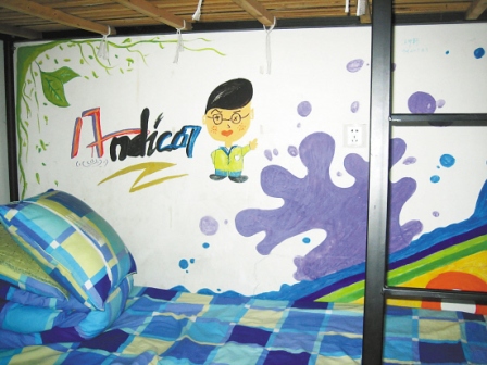 看看這面童趣橫生的手繪墻,它可不是在幼兒園里,也不是在小女孩家里,而是在浙江大學紫金港校區(qū)一個大二男生的寢室里!