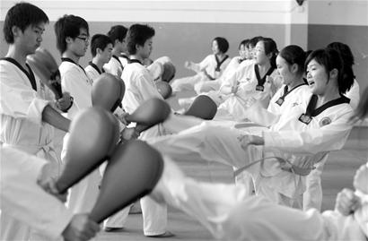 “嚯!哈!……”大學(xué)生會(huì)員們隨著口令,整齊劃一地踢腿。在一片白色的跆拳道服中,活躍的女生身影尤其顯眼,踢腿齊吼時(shí),音量雖趕不上男生,氣勢(shì)卻不輸給他們。跆拳道俱樂(lè)部學(xué)生負(fù)責(zé)人楊城介紹,在400多人的注冊(cè)會(huì)員中,女生人數(shù)比男生還要多。