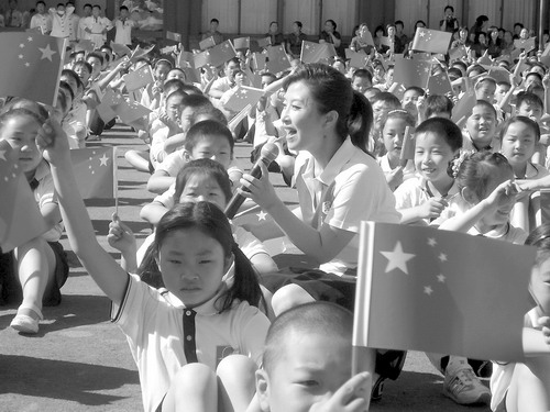 5月31日,北京市東城區(qū)府學(xué)胡同小學(xué)舉行“歡歌慶六一,童心頌祖國(guó)”大隊(duì)會(huì),495名二年級(jí)學(xué)生光榮戴上紅領(lǐng)巾。中央民族歌舞團(tuán)青年歌唱家、“紅旗歌手”劉媛媛與3000多名師生同場(chǎng)高唱新中國(guó)成立六十周年的獻(xiàn)禮新歌《國(guó)家》,表達(dá)了對(duì)祖國(guó)最誠(chéng)摯的祝福。