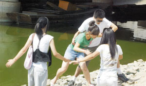昨天上午9:00,大胡同附近的河邊傳來尖叫聲。循著聲音望去,只見河邊站著三名女孩,其中一名穿綠色T恤的女孩最靠近河水!皠e過來,你們再走一步我就下河!闭f著,女孩把一只腳踩進(jìn)水里,另外兩人見狀,只好停下腳步。幾個好心路人見狀趕緊拿出手機要報警,就在這時,幾名男女青年攔住了要報警的人。他們稱站在河邊的三個女孩都是他們的同伴,她們是在“演戲”,不會真的輕生,聽到這兒眾人才算放心。