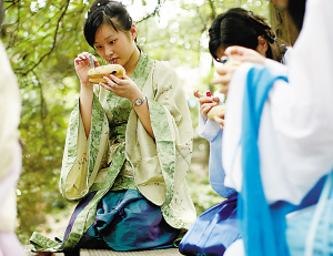 現(xiàn)場組織者玄翎(網(wǎng)名)告訴記者:“乞巧是古人一種儀式,乞巧的含義就是向織女乞求一雙巧手,女子將線穿過七個針眼的過程也是一個祈福的過程。”活動中,女孩們還學(xué)習(xí)整衣冠行漢禮,從提裙跪坐,到跽,再到拜,直至禮成。 (圖片均張春海攝)