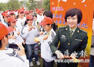 為讓學(xué)子們感受當(dāng)兵的光榮,市征兵辦還請(qǐng)來三位“形象大使”現(xiàn)場宣傳。她們是三醫(yī)大的唐甜和楊菁,以及重慶警備區(qū)女戰(zhàn)士唐勇。唐甜和楊菁是國慶閱兵式上女兵方陣的一員,她們?cè)陂啽缴系娘S爽英姿讓人記憶猶新。而18歲的唐勇雖去年才入伍,但已榮立二等功。