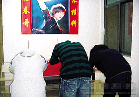 日前,某高校物理學(xué)院同學(xué)小梅在校內(nèi)網(wǎng)上偶然發(fā)現(xiàn)一組雷人的照片:幾名同學(xué)在寢室客廳里貼上了一張巨大的李宇春的海報(bào),兩側(cè)的紅對聯(lián)上赫然寫著“信春哥,不掛科”。對聯(lián)前方是一張鋪著紅布的長方形桌子,上面擺有香煙裊裊的香爐和水果。春哥前,幾個(gè)虔誠的春哥“信徒”手執(zhí)高香,頂禮膜拜。