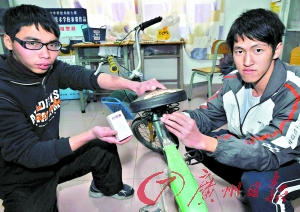 本報(bào)訊 (記者李立志 通訊員南宣)10來元錢的門鈴還有什么其他用途?南沙黃閣成人學(xué)校梁俊斌和張啟華手里拿著一個(gè)自行車的頭籃,一個(gè)自行車的座包,一個(gè)常見的家用門鈴,這就是“自行車防盜報(bào)警器”。他們經(jīng)過三個(gè)多月的時(shí)間研制,發(fā)明了這個(gè)東西。在第25屆廣州市青少年科技創(chuàng)新大賽上,南沙區(qū)黃閣成人文化技術(shù)學(xué)校兩個(gè)農(nóng)村的孩子發(fā)明創(chuàng)造作品《自行車防盜報(bào)警器》獲得了金獎(jiǎng)。
