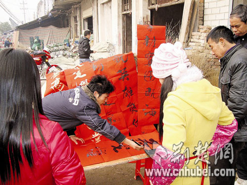 昨日上午,成家良開(kāi)始擺攤賣(mài)春聯(lián),不一會(huì)兒就引來(lái)了不少?lài)^(guān)的人。一名小伙子花了10元錢(qián)買(mǎi)下一副火星文春聯(lián),他說(shuō),成家良賣(mài)的是非主流春聯(lián),夠創(chuàng)意,但“不知道家里人能不能接受”。也有圍觀(guān)的老人不贊同成家良的創(chuàng)意:“他對(duì)書(shū)法的精髓還沒(méi)有完全掌握好,就想著去創(chuàng)新,未免太心急了!