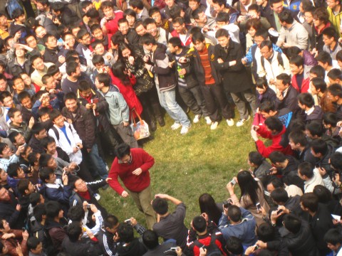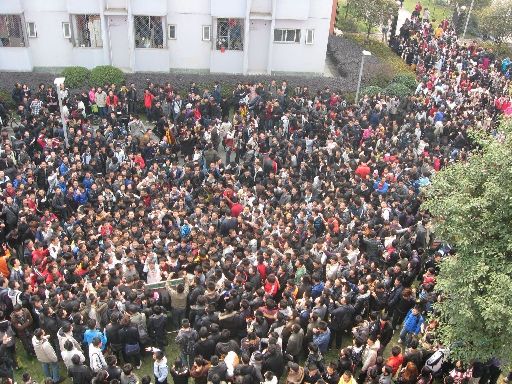 到今日中午,更有上千名“慕名”前來(lái)的校內(nèi)外學(xué)生在女生所指定的樓下“圍觀”,等待著膽大的男生前來(lái)呼叫女主角,附近學(xué)校甚至有學(xué)生“組團(tuán)”前往,并不斷有網(wǎng)友上網(wǎng)發(fā)帖報(bào)告事件進(jìn)展。據(jù)網(wǎng)帖稱,稍后有一穿紅衣男子前來(lái)表白,將現(xiàn)場(chǎng)引向高潮。