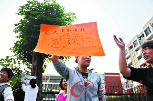 昨日下午4時,數(shù)10名家長聚集在了該幼兒園門口,部分心情激動的家長還打出了寫著“堅決反對漲價”和“退回多收學(xué)費(fèi)”的牌子。