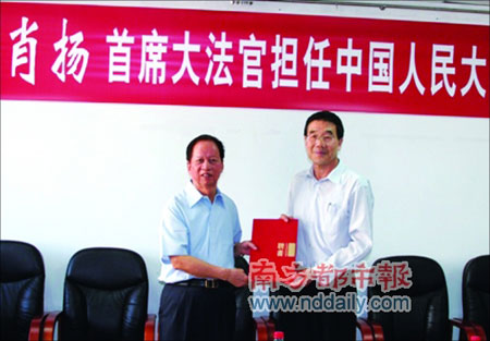 今年71歲的肖揚(yáng),廣東河源人,1957年至1962年曾在人大法律系學(xué)習(xí),畢業(yè)后長期在廣東工作,后歷任司法部部長、最高人民法院院長,是十五、十六屆中央委員。