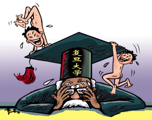日前,兩名畢業(yè)在即的復(fù)旦男生,頭戴學(xué)士帽在校園內(nèi)裸奔慶祝畢業(yè),并拍照留念。 (昨日《羊城晚報(bào)》)