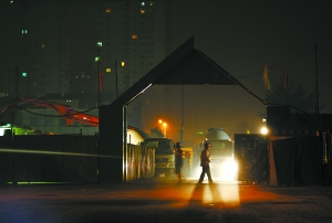 昨天深夜11時許,記者在望京東湖灣小區(qū)東門看到,這里的在建工地?zé)艋鹜鳎懧曇黄,距離已經(jīng)入住的居民樓不過百米遠。記者隨即繞行到小區(qū)南門發(fā)現(xiàn),一輛掛著“甘”字車牌的水泥攪拌罐車順著坑洼不平的馬路,駛離了工地。此時,工地大門大敞著,工地內(nèi)另一輛水泥攪拌罐車打著雙閃待命,工地中機械轟鳴聲不絕于耳,還不時地傳出施工車輛“嘀、嘀、嘀”的倒車聲,直至今晨零時記者離開現(xiàn)場時,夜間施工仍未停止。