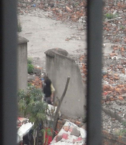 發(fā)帖者說(shuō),“成都某大學(xué)的一對(duì)情侶就這樣饑渴難耐啊,在學(xué)校附近一被拆遷的房子一堵墻下偷歡,沒(méi)有一片瓦為他們遮擋,太可悲了!