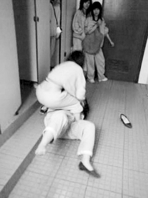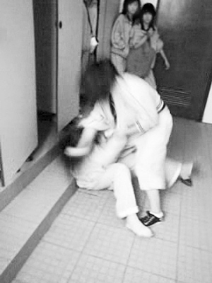 殷瓊是上海西南工程學校一年級學生。4月16日下午,她參加考試,題目差不多做完了,同學小成對她耳語:“下課去校門口,有人找你談話。”殷瓊沒答應,小成幫她交卷,把她拉到校內一幢大樓2樓女廁所門前,那里還有幾個女生在等著。拉扯進廁所后,另一名同學劉幸一邊拍她肩膀挑釁,一邊讓其他女生打開手機攝錄。視頻記錄了殷瓊的噩夢,殷瓊的母親向記者出示了這段影像: