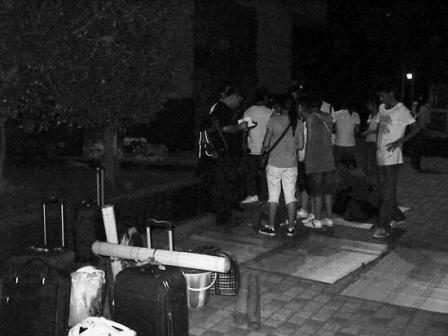 當時,大部分學生帶來的錢已經(jīng)用完了。有的一整天沒吃飯,有的連回家的路費也不夠了。晚上10點半, 20多個學生蜷在中信國際大酒店停車場的綠化帶邊,打起了地鋪,身邊堆滿了大大小小的行李。14名女生和9名男生(除9人外,還有4名男生滯留其他地方)流落街頭。