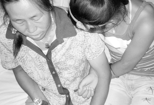 ●女童小月(化名)雙手緊緊抓住母親和姐姐的胳膊,腳步匆忙地閃進(jìn)記者的房間。隨著“咔嗒”的關(guān)門聲,她驚恐地抬起頭,死盯著門閂看了三五秒鐘,直到母親伏在耳邊說(shuō)“門已經(jīng)上鎖了”,才肯坐在床沿,將身體埋在母親懷里。