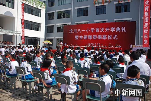 中新網(wǎng)汶川8月30日電(鐘美蘭)紅旗招展,彩帶飄飄。30日,由第二炮兵對口支援,在廢墟原址上建設(shè)汶川八一小學開學,學校舉行了隆重的開學典禮。