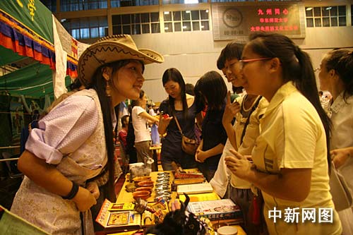 在藏族展臺邊,記者看到,身著藏族服裝的兩位藏族男生將藏飾、藏族食品以及青稞酒擺了滿滿一桌。兩位藏族學(xué)生一邊向大家介紹從家鄉(xiāng)特別帶回的奶酪、炒青稞以及藏豆等食物,一邊忙著以內(nèi)地少見的酥油茶招呼同學(xué)。有瓜果之鄉(xiāng)的新疆維吾爾族展臺更是琳瑯滿目。身著鮮艷的維族服裝的少女亦忙著向漢族同學(xué)介紹美麗的家鄉(xiāng)。