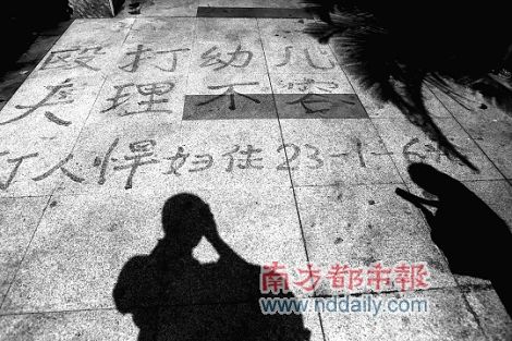 好事不出門(mén),壞事傳千里。就是那沉重的一記耳光,蔣某成了小區(qū)“名人”,她所居住的23棟也成了鄰里關(guān)注的焦點(diǎn)。在該單位門(mén)口地上,一幅揮墨如潑的“書(shū)法”格外引人矚目,“毆打幼兒 天理不容 打人悍婦住23-1-××”,鄰居透露此乃被打男童蒙蒙(化名)爺爺?shù)慕茏鳌?/p>