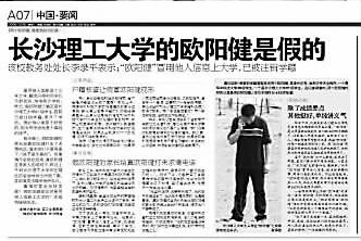 在長(zhǎng)沙理工大學(xué)讀大三的“歐陽(yáng)健”,在接受湖南媒體采訪時(shí),也稱(chēng)自己的成績(jī)和身份不假。26日,湖南某報(bào)推出跟蹤報(bào)道《長(zhǎng)沙理工大學(xué)的歐陽(yáng)健是假的》。報(bào)道稱(chēng),長(zhǎng)沙理工大學(xué)教務(wù)處表示那里的“歐陽(yáng)健”,冒用他人信息上大學(xué),已被取消學(xué)籍。