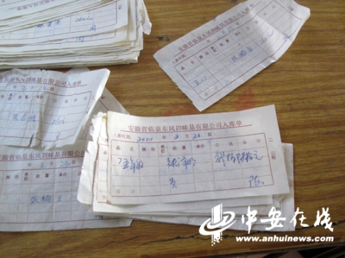 李校長還給記者出示了今年收取260元費(fèi)用的收據(jù),收據(jù)上居然印著“安徽省臨泉東風(fēng)調(diào)味品有限公司入庫單”的字樣,上面寫著學(xué)生的姓名、班級(jí)和所交的260元費(fèi)用,每一張右下角都是用相同筆跡簽了一個(gè)“周”字,據(jù)李校長介紹簽“周”字的人是陳子玉的兒媳婦,她負(fù)責(zé)來學(xué)校收錢。