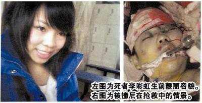 去年12月26日凌晨,湖南打工妹李彩虹離開工作的酒店返回宿舍,誰料走到花都區(qū)新華街與商業(yè)大道的交叉口時(shí),一輛紅色寶馬Mini小轎車飛馳而過,將她撞死。駕車人是廣東外語外貿(mào)大學(xué)大三學(xué)生任偉煒。兩人是同齡人,當(dāng)時(shí)都只有21歲。肇事者任偉煒當(dāng)即駕車逃逸,至今未歸案。