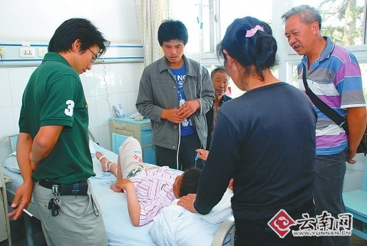 事情過去快一周了,但躺在玉溪市人民醫(yī)院病床上的斌斌(化名)和席席(化名)臉上還有明顯的燒傷痕跡。斌斌的傷情是在所有傷者中最嚴重的,被火燒到臉部和手部以后,他還去水龍頭下洗了頭,結(jié)果把臉上和手上的一大塊皮都抹了下來。