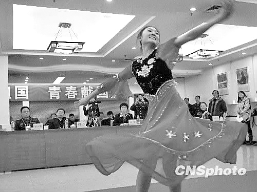 8時(shí)10分,面試開(kāi)始,第一個(gè)上場(chǎng)的陳曉琴做了簡(jiǎn)單的自我介紹,大屏幕顯示她抽中的問(wèn)題是:如何能做一個(gè)合格的軍人。陳曉琴說(shuō),要做一名合格的軍人不但要嚴(yán)明紀(jì)律、聽(tīng)從指揮,還要團(tuán)結(jié)同志。接著她表演了跆拳道,并拿下了北京市女兵面試的第一個(gè)分?jǐn)?shù)——26分,全部考試,陳曉琴用了8分鐘。 8時(shí)50分,來(lái)自民族大學(xué)舞蹈學(xué)院的5號(hào)應(yīng)試者朱瑜上場(chǎng)了;卮鹆讼嚓P(guān)的問(wèn)題后,她拿出了一把藍(lán)色的綢扇,跳起了一套她自編的舞蹈,婀娜的舞姿征服了全場(chǎng)的觀眾,也征服了9位評(píng)委,她得了28.57的高分,這個(gè)分?jǐn)?shù)也是海淀考區(qū)全天考試的最高分。與她同樣得了最高分的還有清華大學(xué)的王曉麗。