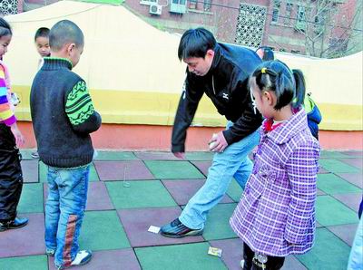 而在“玩”的時候,男女老師的不同就會顯現(xiàn)而出。據(jù)介紹,女老師一般是和孩子們玩一些如丟手絹之類活動量較小的游戲,而男老師就會帶著孩子們玩一些活動量較大的項目,比如競技賽跑等。“男老師帶的班上的孩子會比較‘瘋’,這是我們愿意看到的,孩子充滿活力是件好事!眲⒚麝栒f。