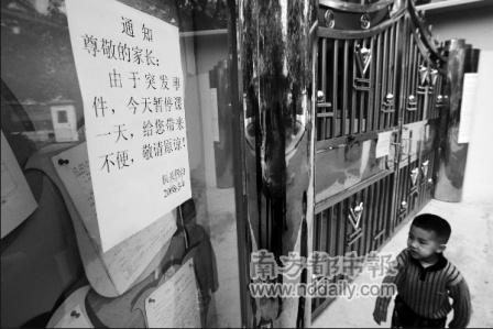 在公開(kāi)信的邊上還貼著一份機(jī)關(guān)四幼的通知,稱(chēng)“由于突發(fā)事件,今天暫停課一天”。在這份通知的左下角,有人用圓珠筆歪歪扭扭地寫(xiě)下了不滿(mǎn):“家長(zhǎng)要求退還所有費(fèi)用,到其他學(xué)校上學(xué)!