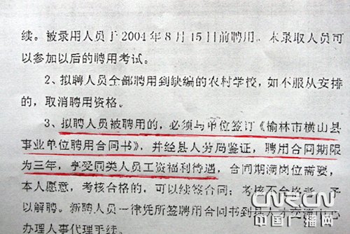 雷波說,他參加工作后,日子越過越窮,孩子感冒都不敢去醫(yī)院治療。類似雷波的遭遇,在180名選聘教師的每個人身上都上演著。從4月2號開始,這些教師紛紛丟下學(xué)生,到橫山縣人民政府討說法。橫山縣人事和勞動社會保障局辦公室的工作人員稱,當(dāng)初的考試是為解決中專生就業(yè)而進(jìn)行的,雷波等人屬于民辦教師,難以做到與中專生同工同酬。