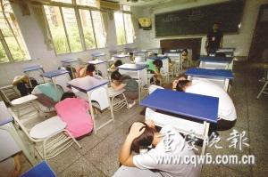 “由于發(fā)生余震,請同學們迅速疏散,到操場集合!”昨下午3時50分,一場特殊的高考防震演習在重慶市八中第二教學樓舉行。200多名高一學生在聽到廣播發(fā)出的指令后,快速從教室跑到操場上,整個過程用時不到兩分鐘。