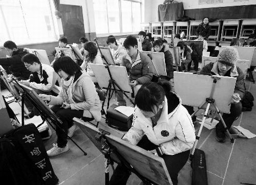28日,山東省首次美術(shù)統(tǒng)考開考,5.4萬考生赴考。由于統(tǒng)考將使考生的機會相比去年有所減少,考生感覺“壓力比去年的考生大”。對于今年的統(tǒng)考試題,部分考生認為“不容易” ,一些高中教師認為“題目較為科學(xué),能夠充分考查考生的綜合專業(yè)水平”。
