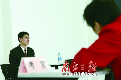 記者在現(xiàn)場(chǎng)看到,不少警校出來(lái)的考生都身穿警服來(lái)面試,這群“準(zhǔn)警察”在西裝革履的考生群中尤為醒目,但他們?cè)谶M(jìn)入考場(chǎng)上交手機(jī)等通訊工具時(shí),隨即被要求把警號(hào)摘下,以免在面試過(guò)程中透露個(gè)人信息,影響考試的公平性!霸鞠M诿嬖囍汹A取一些形象分和同行分,但效果并不大!币幻忌鷮(duì)記者說(shuō)。參與面試的7名考官中,只有兩名是來(lái)自公安系統(tǒng)的同行,其余5名皆是來(lái)自其他行局的考官。