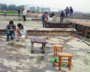 3月 28日上午,是今年全國計算機考試的筆試時間,據(jù)該學員說,老師考前讓每名考生帶一位親友,統(tǒng)一在學校教室集合。筆試開始幾分鐘后,教室里的老師便得到了考題。老師在黑板上一行行地寫出了:1-5324431-641423……人們紛紛拿出手機(見上圖)。20多分鐘后,這名老師擦去黑板上的字,急急離去。由于朱洪學校當天參加筆試的約有幾百名學員,從教室里到外面空地,忙著發(fā)送短信的考生親友隨處可見(見下圖)。該知情者說,那名老師寫在黑板上的 “32443”分別代表著“CBDDC”,這些“數(shù)字”和隨后寫出的“漢字”,便是筆試中的“選擇題”和“填空題”的答案。