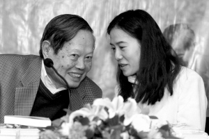 首發(fā)式上,楊振寧身著西服精神矍鑠,翁帆穿白色上衣溫婉大方。夫婦雙雙坐定面向讀者時(shí),全場(chǎng)響起熱烈的掌聲。在隨后的活動(dòng)中,翁帆除了充當(dāng)楊振寧的“耳朵”,偶爾為他重復(fù)讀者、媒體的問題外,倘若沒問到自己頭上,基本一言不發(fā),關(guān)注著楊振寧及其他嘉賓的講話。聽到楊振寧發(fā)表的觀點(diǎn)與見解后,時(shí)而點(diǎn)頭稱贊,時(shí)而頷首微笑。