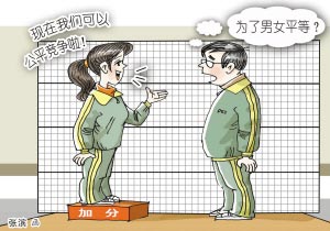 對于合理性的要求,則應(yīng)該再仔細(xì)商榷!芭⒃谏敫咧谢蚴泄芨黝愔袑、職業(yè)學(xué)校時(shí),筆試總成績加2分!睆默F(xiàn)實(shí)來看,女孩的考試能力并不比男孩差,這樣的差別待遇,可能不具有說服力。