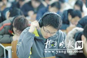 本次考試江蘇省共設(shè)223個(gè)考點(diǎn)、26212個(gè)考場,134所高校的780489名考生報(bào)名參加考試,比去年同期增加108450人,增幅16%,報(bào)考規(guī)模再創(chuàng)新高,仍居全國第一。圖為江蘇工業(yè)學(xué)院的一名考生正在調(diào)試耳機(jī)。 楊素平 攝