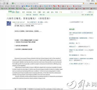 考試結(jié)束之后,記者查閱了新浪、搜狐等網(wǎng)站上刊登的六級考試試題及參考答案,發(fā)現(xiàn)與這個帖子里的試題和答案基本相符,僅有少數(shù)題目的答案稍有差異。