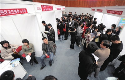 昨天,近幾年來(lái)本市首場(chǎng)中小學(xué)教師專場(chǎng)招聘會(huì)在首師大體育館舉行,1.3萬(wàn)名北京高校應(yīng)屆畢業(yè)生蜂擁而至,競(jìng)爭(zhēng)132家本市中小學(xué)提供的1100余個(gè)崗位。在招聘現(xiàn)場(chǎng),市區(qū)學(xué)校攤位前人頭攢動(dòng),而郊區(qū)學(xué)校則門可羅雀,兩極分化嚴(yán)重。