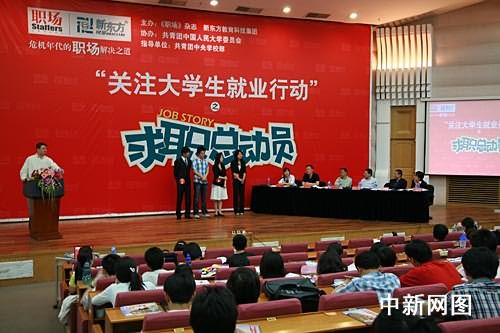 中新網(wǎng)北京5月9日電 共青團中央學(xué)校部指導(dǎo)、新東方教育科技集團和《職場》雜志聯(lián)合推出的“求職總動員”活動今天在中國人民大學(xué)啟動,這次活動將充分發(fā)揮團組織、教育機構(gòu)和媒體的不同作用,攜手知名企業(yè)、職場咨詢團走入十所城市、十座大學(xué),把實習(xí)、就業(yè)的機會和求職秘籍帶給即將畢業(yè)的大學(xué)生,并提供2000余個實習(xí)機會,幫助更多的大學(xué)生找到心儀的工作。