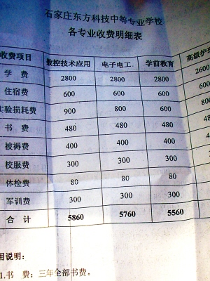 如果學(xué)生想自己找實(shí)習(xí)單位,就要交3000元錢(qián)。其中1000元是注冊(cè)費(fèi),2000元是伙食費(fèi)!拔覀兪桥c石家莊協(xié)和醫(yī)學(xué)院聯(lián)合辦學(xué)的,發(fā)的是那所學(xué)校的畢業(yè)證,注冊(cè)什么的都需要錢(qián),這個(gè)錢(qián)就得學(xué)生來(lái)出!边@位老師說(shuō),從去年5月份開(kāi)始,學(xué)校的食堂就對(duì)學(xué)生和教職工免費(fèi)開(kāi)放了。小張去年7月從廣東打工回來(lái),暑假后來(lái)上學(xué),從9月到現(xiàn)在,在學(xué)校免費(fèi)吃了7個(gè)月的飯,按每月300元算,是2100元,學(xué)校收2000元是合適的。