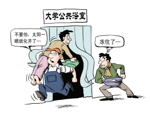 本月18日晚,汕頭大學(xué)J座宿舍出現(xiàn)熱水循環(huán)系統(tǒng)無法正常工作的故障,該校學(xué)生社區(qū)管理服務(wù)中心查明原因后,貼出維修告示,聲稱問題需到第二天才能修復(fù)。消息一出,男生小米迅速把QQ的簽名檔改為:“今晚冇熱水,聽朝再沖涼!蓖奚岬男↑S則是拍拍胸膛,咬緊牙關(guān),“雄赳赳”地走進了浴室,高歌驅(qū)寒氣,“嚎叫”聲響徹宿舍……