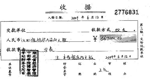 6月15日,學(xué);I集了45萬元現(xiàn)金,匯給了楊某的指定賬戶。令人意外的是,這個(gè)賬戶并不是學(xué)校的公共賬戶,而是一個(gè)名叫“王貞”的私人賬戶。等他們拿到收據(jù)后,上面蓋的公章是“湖北省經(jīng)濟(jì)管理干部學(xué)院博智教學(xué)站”。