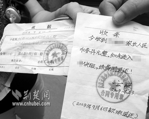 據(jù)學(xué)生家長(zhǎng)易女士介紹,她家住漢口頭道街,小孩今年剛剛讀初一。一年前,孩子讀六年級(jí)的時(shí)候,她在家附近的“武漢博淵培優(yōu)公司”給孩子補(bǔ)習(xí)數(shù)學(xué)。7月12日,小孩回家后告訴她說,培優(yōu)老師稱他在附近的中學(xué)有關(guān)系,可以介紹學(xué)生進(jìn)快班,不過要收取3000元錢。于是,易女士交給了培優(yōu)老師3000元錢,并拿到了一張收條。收錢方承諾,進(jìn)不了快班就退錢,落款名為“云波”。