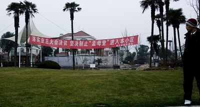 昨日,“孟母堂”和錦軒新墅小區(qū)的大門都已恢復平靜,小區(qū)大門處懸掛著一條紅色橫幅,上面寫著“堅決制止‘孟母堂’進入本小區(qū)”,落款為“錦軒新墅業(yè)委會”。