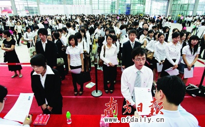 當(dāng)日,深圳大學(xué)2009屆法學(xué)專業(yè)學(xué)生小楊早上7時30分就和同學(xué)坐車趕到了會展中心,本以為能“趕個早集”,哪知道會展中心門口早已排滿了幾萬名從全國各地趕來的畢業(yè)生。等到8時30分會展中心提早開門時,弱小的小楊花了很大的力氣才“好不容易”被“推”進了會場。然后,她花了近2個小時把整個會場轉(zhuǎn)了一遍,雖物色到了符合自己要求的企業(yè),但是因為人太多,她沒有投出一份簡歷。